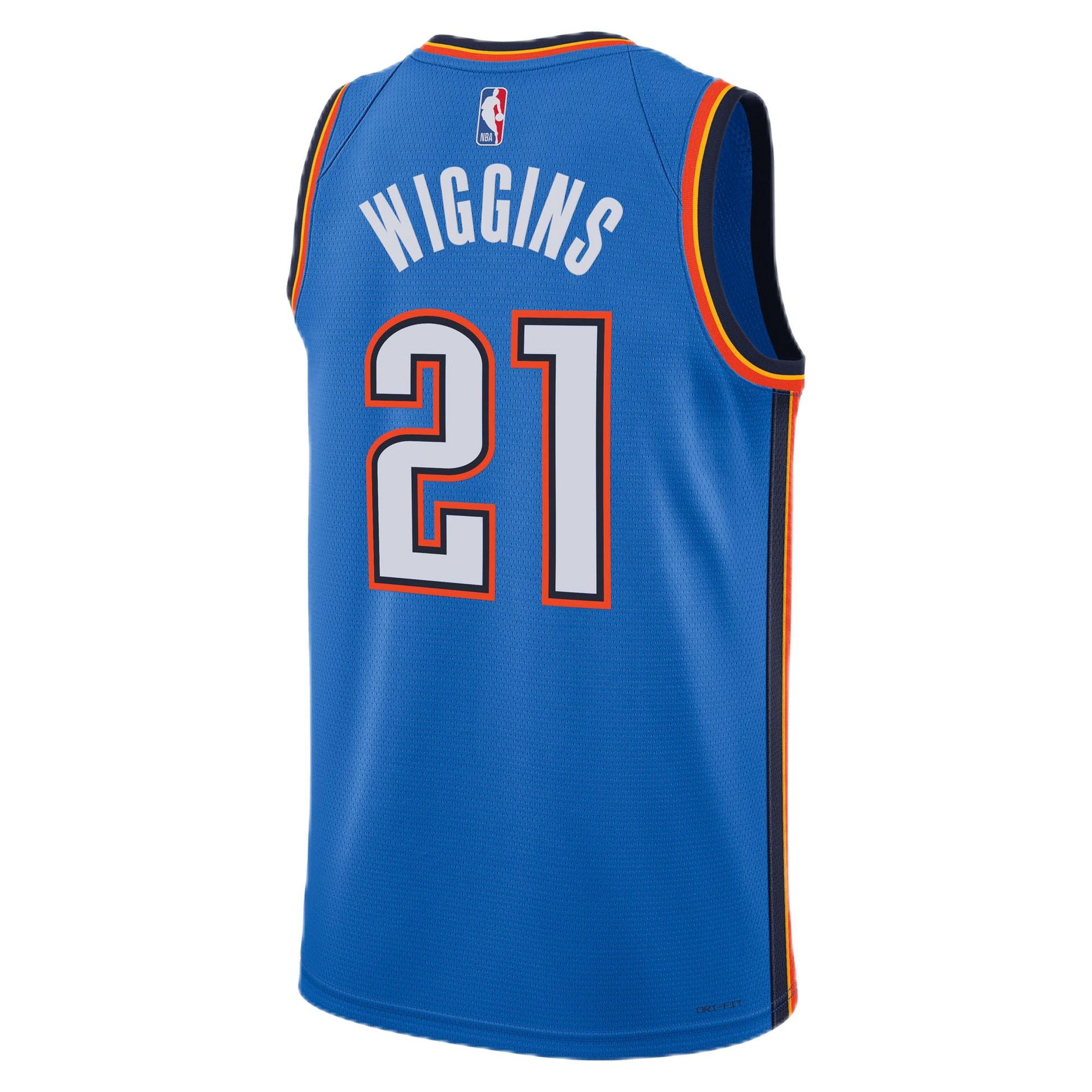 The vibrant blue colorway, accented with bold white and orange details, embodies the team's relentless and modern identity.This jersey is a perfect tribute to Wiggins' all-around game and vital role off the bench, with his iconic #21 prominently displayed. Secure yours today and be a part of the excitement as Wiggins helps the Thunder continue their rise to the top.