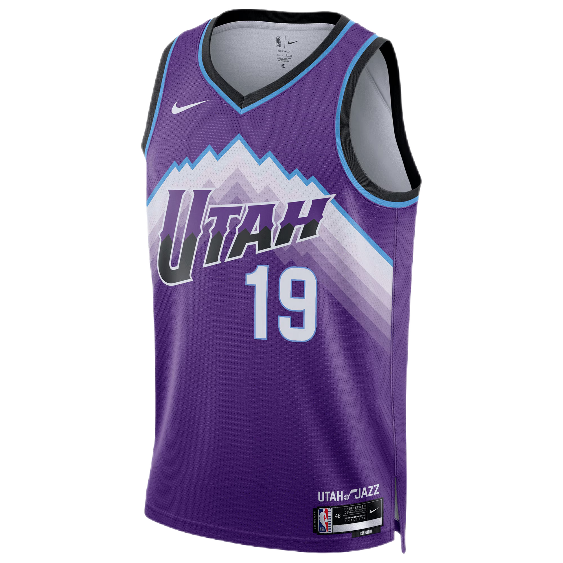 This jersey features a sweeping "Purple Mountain" design across the chest, which is a powerful homage to one of the most celebrated eras in franchise history. With his iconic #19 proudly displayed, this is a must-have for any true Jazz fan who wants to show their support for the future of the team.