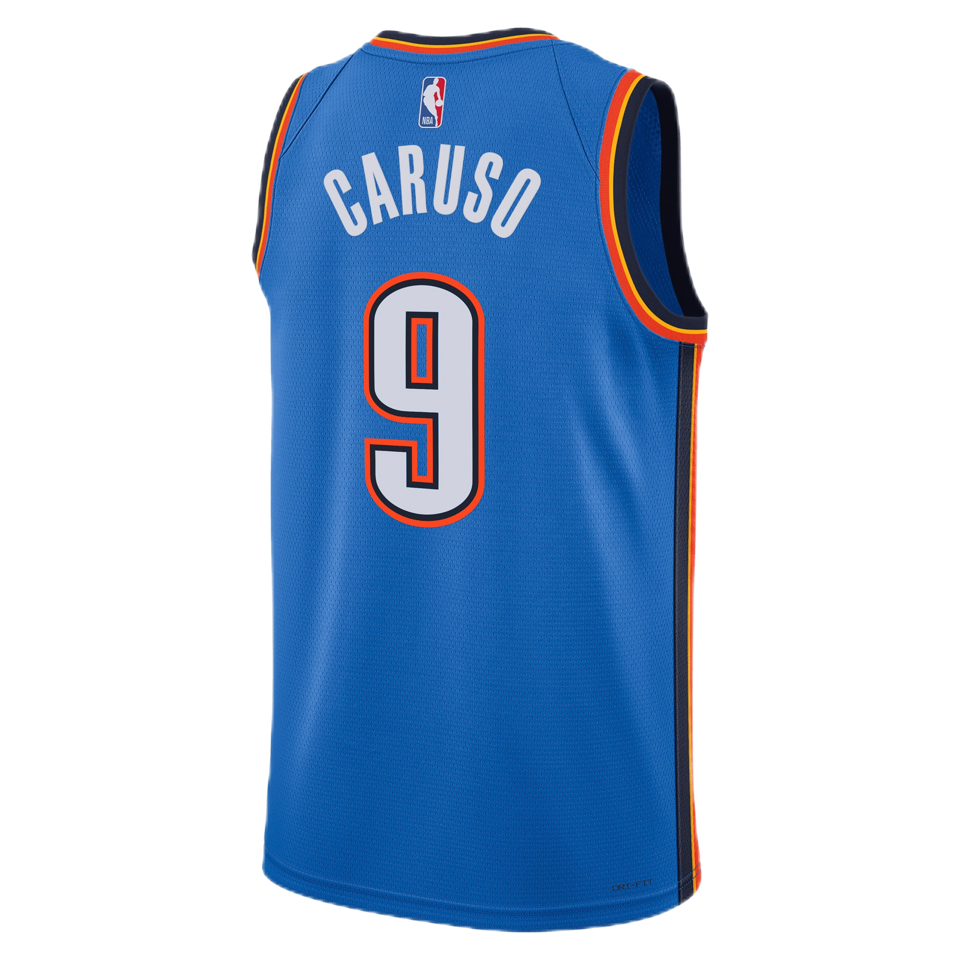 The vibrant blue colorway, accented with bold white and orange details, embodies the team's relentless and modern identity. This jersey is a perfect tribute to Caruso’s elite defense, high basketball IQ, and unwavering work ethic, with his iconic #9 prominently displayed. Secure yours today and be a part of the excitement as Caruso helps the Thunder continue their rise to the top.