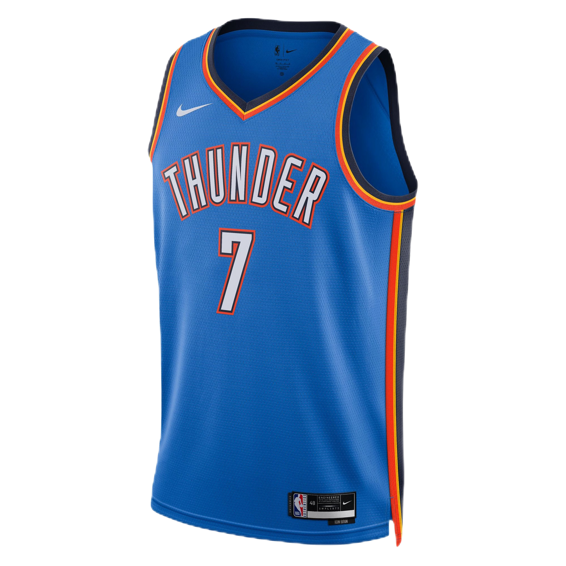 This classic blue jersey features bold white and orange accents, representing the team's timeless and championship-winning style. This jersey is a must-have for any true Thunder fan, with Chet’s iconic #7 prominently displayed. It's a symbol of his game-changing presence, from his elite shot-blocking to his fluid offensive game. Secure yours today and be a part of the excitement as Wemby redefines the game.