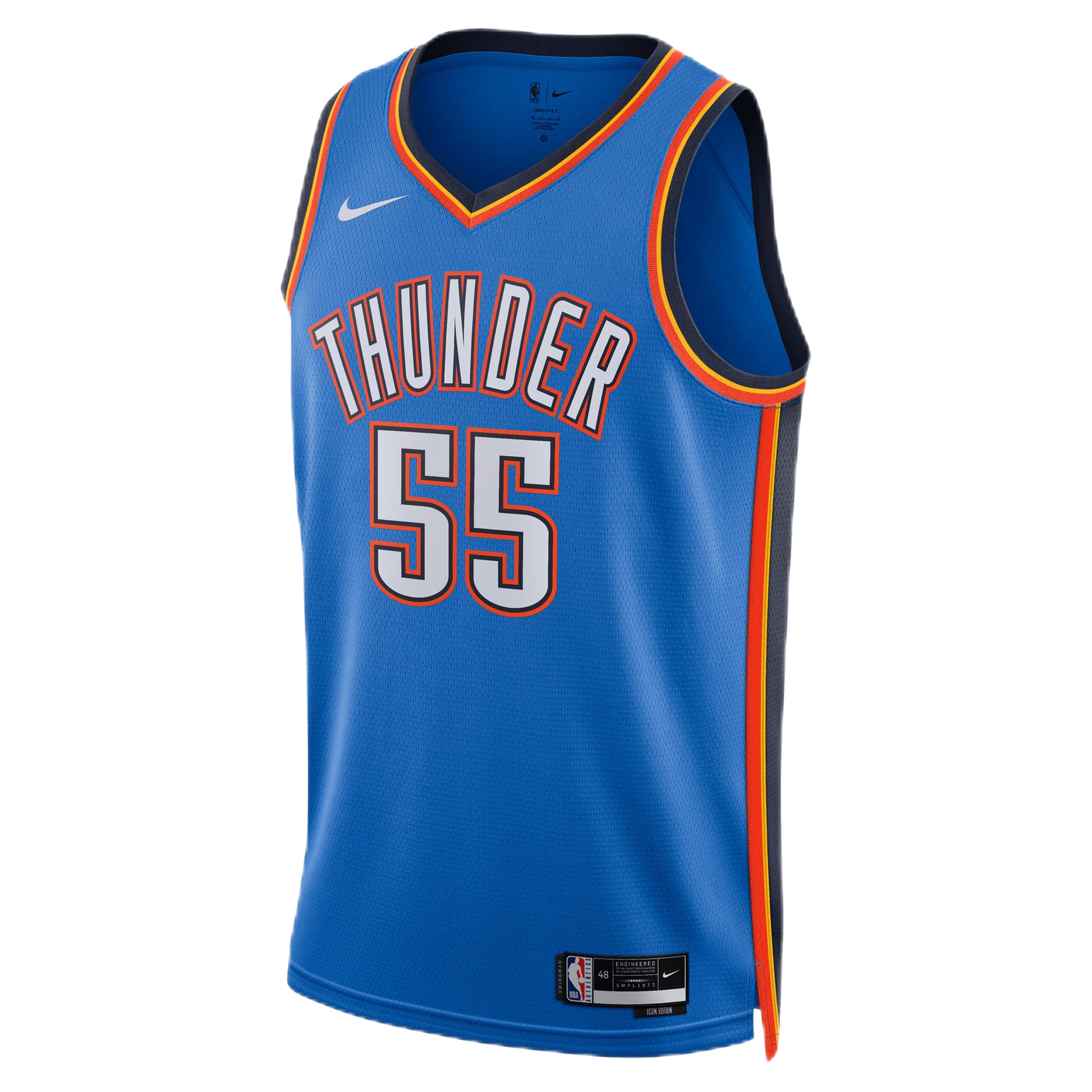 The vibrant blue colorway, accented with bold white and orange details, embodies the team's relentless and modern identity. This jersey is a perfect tribute to Hartenstein’s unique style of play, from his powerful rebounding to his elite playmaking, with his iconic #55 prominently displayed. Secure yours today and be a part of the excitement as Hartenstein helps the Thunder continue their rise to the top.