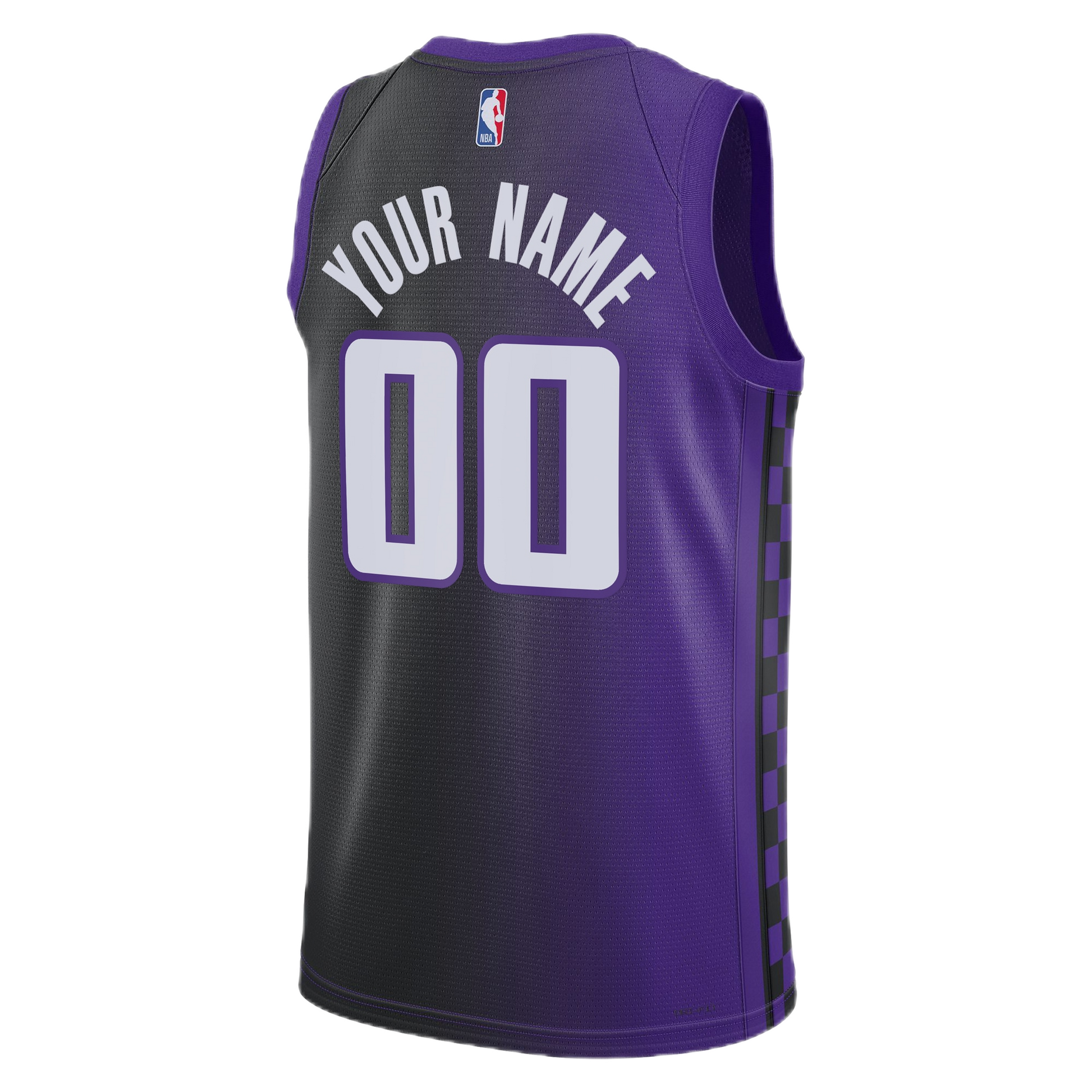 Show your Kings pride with the Personalized Sacramento Kings Purple Statement Jersey. This bold purple and black jersey features the "Kings" logo across the chest and stylish checkerboard stripes on the sides.